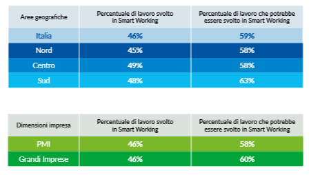 L’emergenza Coronavirus ha spinto le aziende a ricorrere in massa allo smart-working: circa il 97% ha attivato questa nuova modalità di lavoro e molte imprese sono disposte ad aumentare la gestione a distanza delle attività anche dopo la fine dell’emergenza. Attualmente il 46% delle attività lavorative sono gestite a distanza, ma con ulteriori investimenti le aziende affermano di poter arrivare fino al 59% (+12 per cento). Qui puoi trovare il report integrale.